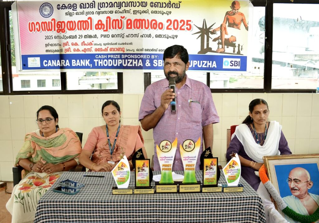 തൊടുപുഴ: ഗാന്ധി ജയന്തിയോടനുബന്ധിച്ച് ജില്ലാ ഖാദിഗ്രാമ വ്യവസായ ഓഫീസിന്റെ നേതൃത്വത്തിൽ ജില്ലയിലെ ഹൈസ്കൂൾ, ഹയർ സെക്കണ്ടറി സ്കൂൾ വിദ്യാർത്ഥികളെ പങ്കെടുപ്പിച്ച് ഗാന്ധിജിയും ഖാദിയും സ്വാതന്ത്ര്യ സമരവും പൊതു വിജ്ഞാനവും ആസ്പദമാക്കി ജില്ലാ തല ക്വിസ് മത്സരം സംഘടിപ്പിച്ചു. സംസ്ഥാന ഖാദി ബോർഡ് മെംബർ കെ.എസ്.രമേഷ് ബാബു ഉദ്ഘാടനം ചെയ്തു.